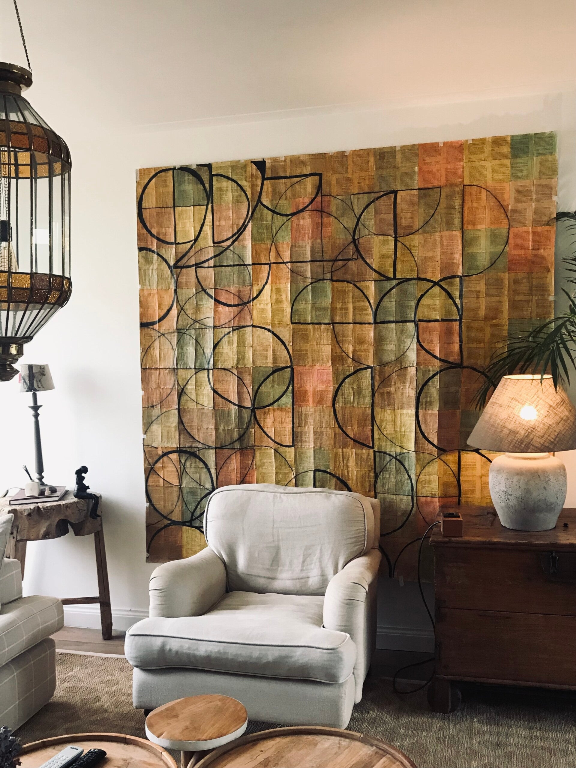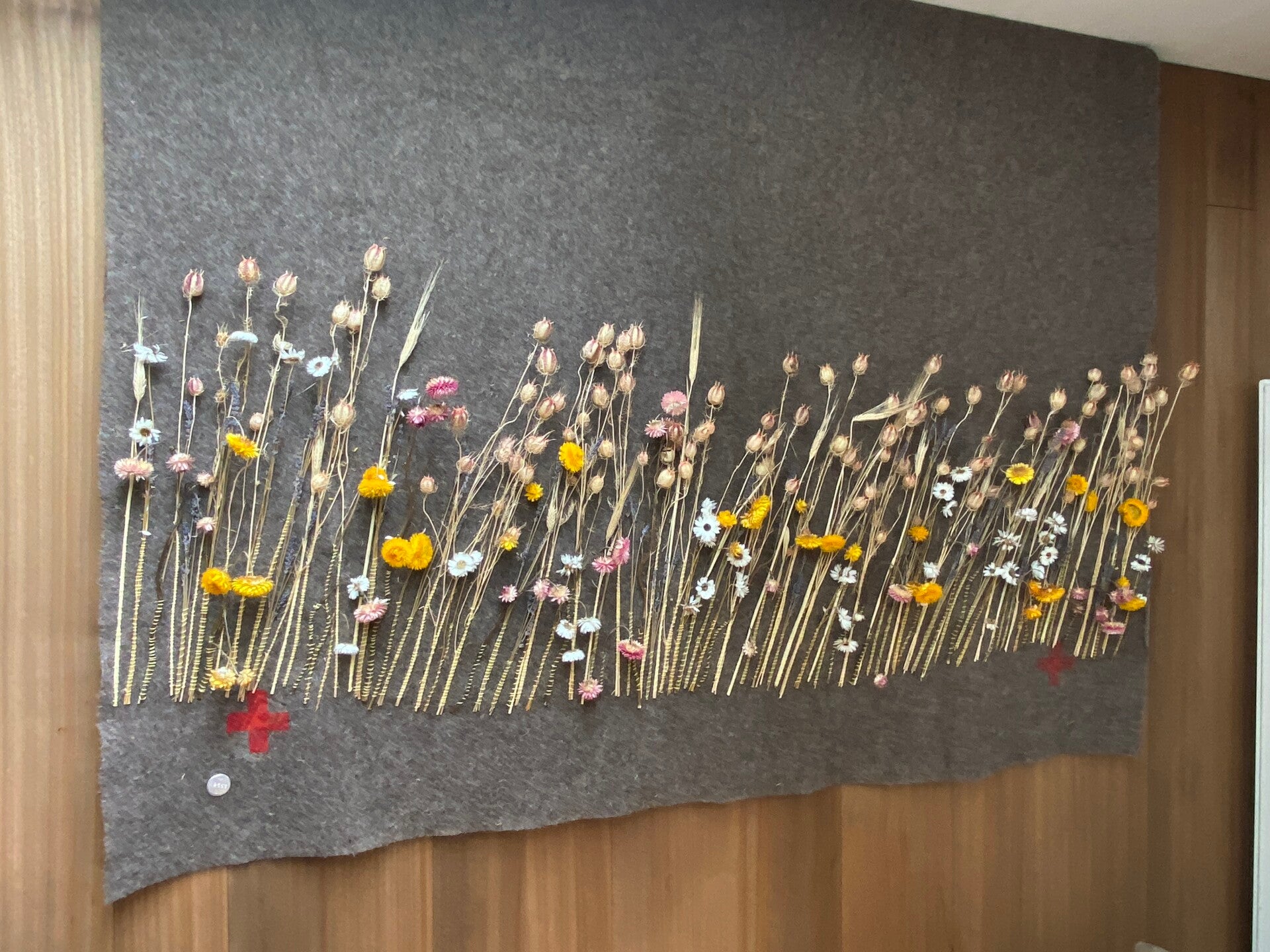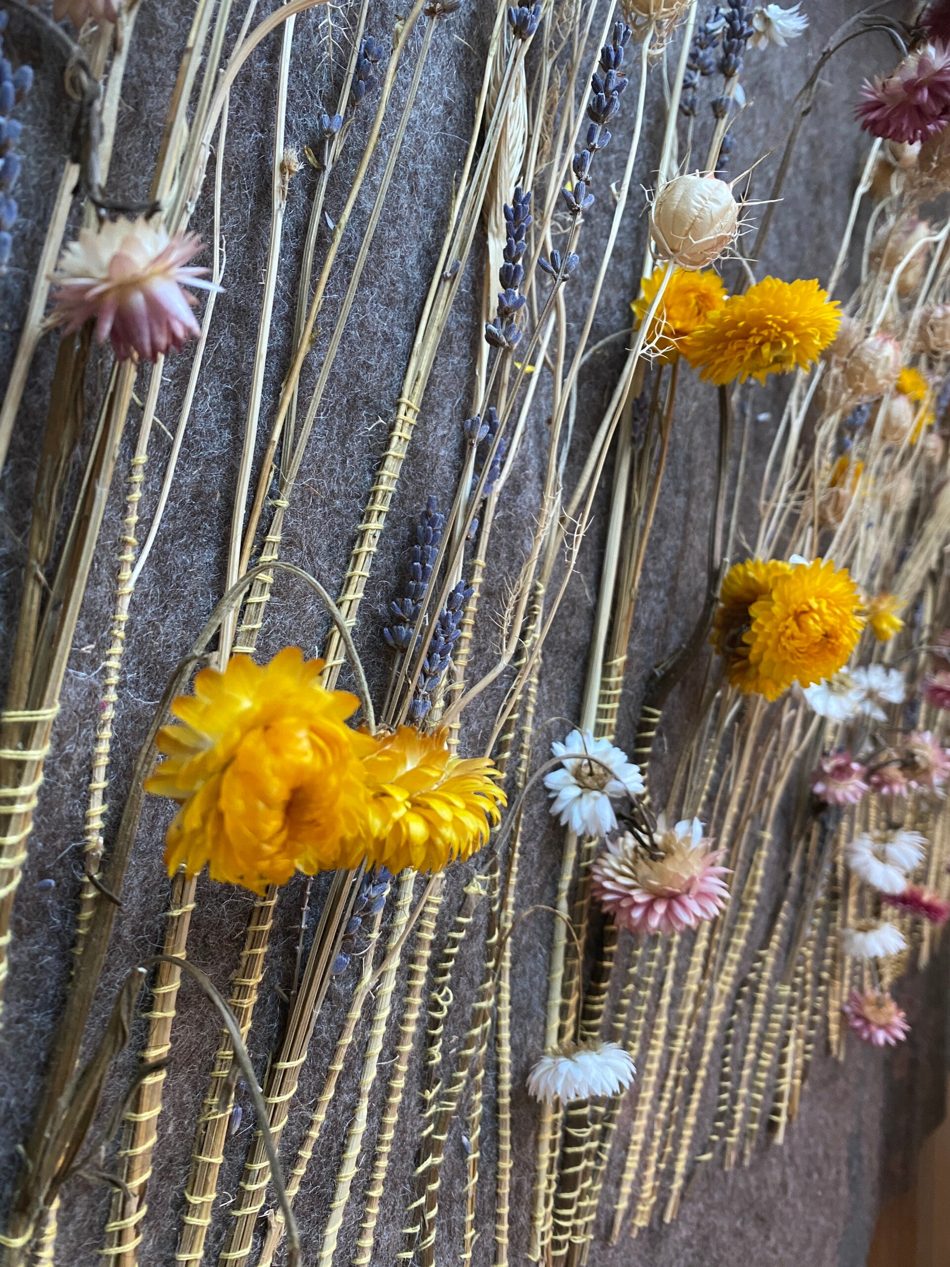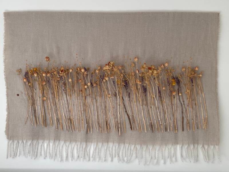 Het werken met gedroogde bloemen in een vorm die bij mij past. De inspiratie haalde ik uit de muurtapijten van de paleizen. Deze hielpen om de kou tegen te houden en als decoratie. Sommige kleden werden gemaakt door meerdere generaties. Deze wollen deken is van de marine geweest. Welke veldslagen er ook zijn geweest daar zie je na jaren de natuur weer herstellen alsof het nooit anders is geweest.