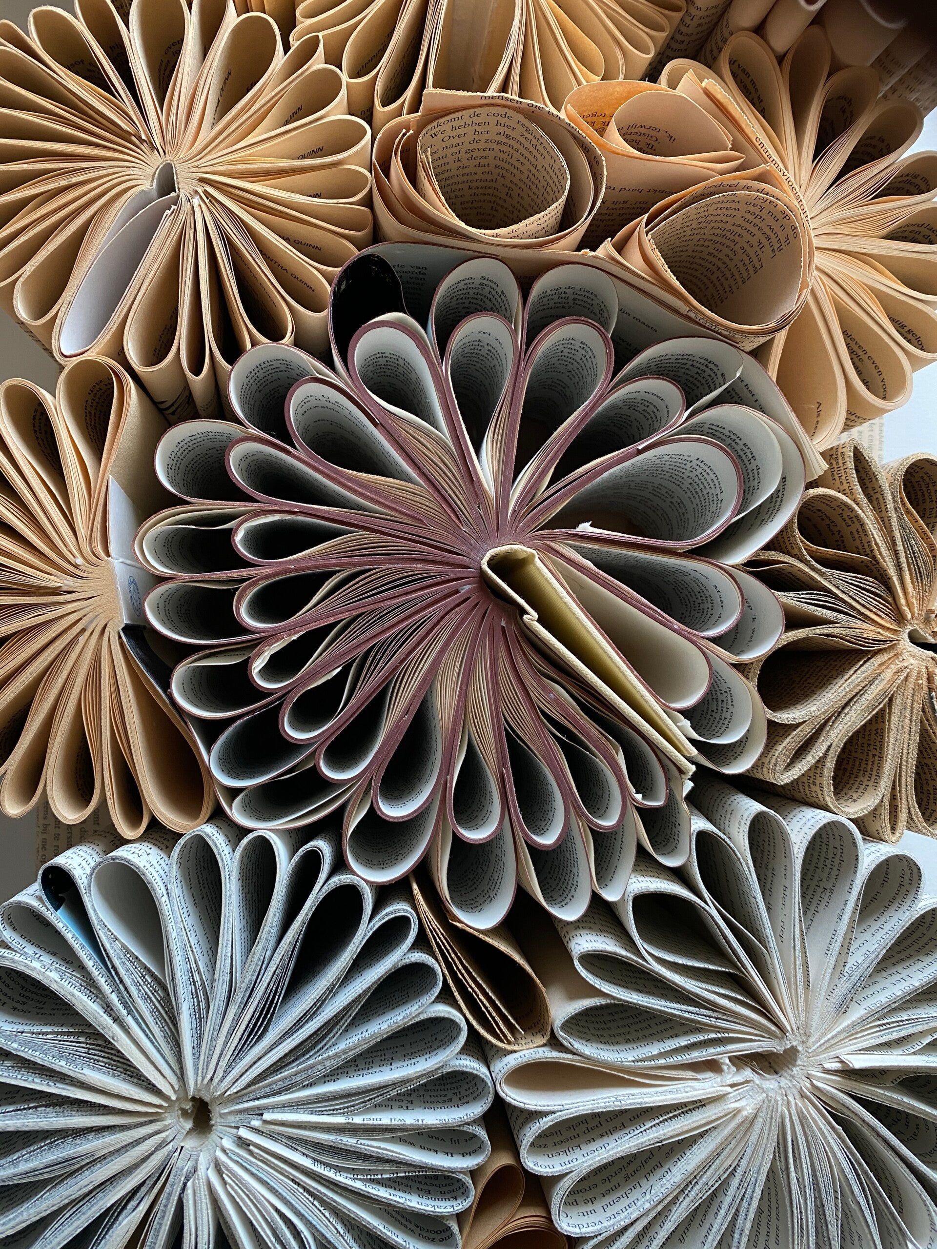 Ik vind het belangrijk om materialen te hergebruiken. Boeken zijn daar erg geschikt voor. De diversiteit in kleur, grote en dikte kun je een mooie compositie maken. Dit is een twee luik maar je kan oneindig groot werken met dit materiaal.